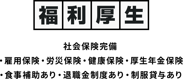 | 待遇 | 雇用保険、労災保険、健康保険、厚生年金、昇給・賞与有、交通費規定内支給、車通勤可、残業手当、家族手当、退職金制度、作業服、靴貸与、食事補助 |