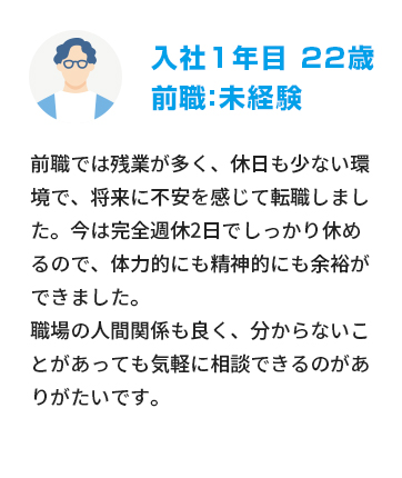 | 勤務時間・曜日 | 8:30〜17:00 (残業あり) |