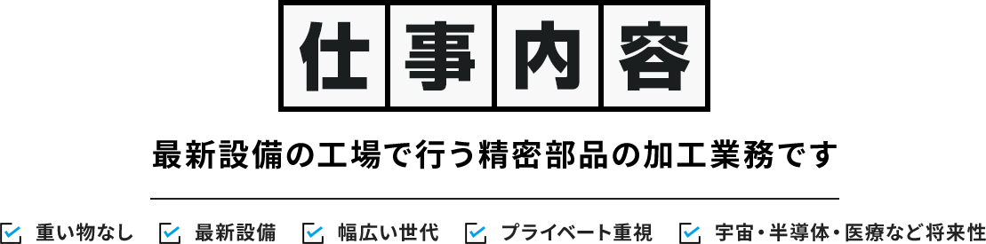 | 仕事内容 | ・機械加工された部品の仕上げ業務 (検査、梱包等)を主に担当して頂きます。 ・細かい部品などを検査する作業となります。 ※未経験の方でも安心して作業できる業務です。 |